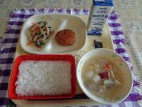今日の献立は、「ごはん ミンチカツ 千草あえ 豆乳仕立ての野菜汁 牛乳」でした。