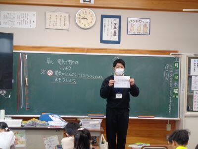 理科の授業。本時では、「電球はどのようにしたらつくのか」を予想しました