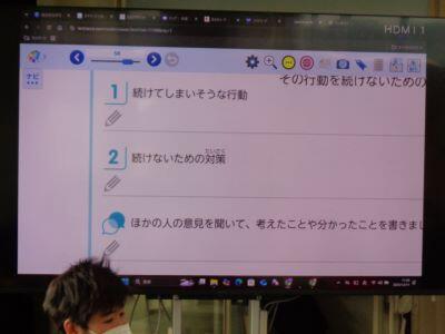 保健の授業。自分の生活習慣について振り返り、友達と情報を共有しています