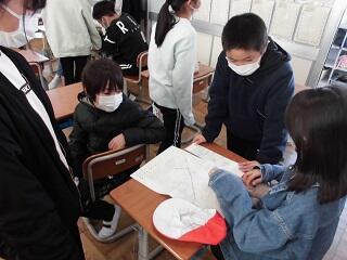 昼休みの時間を使って、令和4年度の新登校班編成が地区ごとに行われました。各教室に分かれ、班長・副班長を中心にして集合場所や集合時刻の確認をしました。
