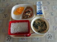 今日の給食は「セルフ中華丼(ごはん・中華丼の具) 牛乳 みかんゼリー 中華風玉子コーンスープ」でした。