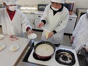 グループごとに分かれて、豆腐作りにとりかかりました。豆乳の温度が80℃になるまで温め、にがりを入れてよく混ぜました。