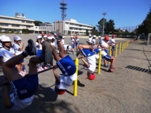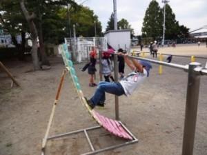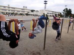 ↓昼休みに、逆上がり練習器を使って、熱心に逆上がり練習をする1年生。「がんばれ~!!」