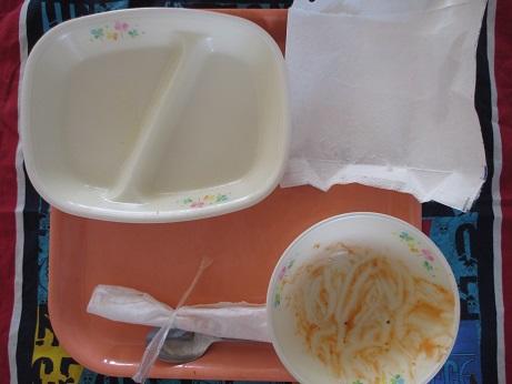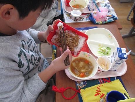低学年は、箸だけで納豆を食べるのは、少し大変です。ですが、あえてスプーンは出していません。がんばって、箸で食べます。