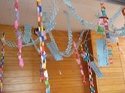 1年生の教室の入り口や廊下に、折り紙で作ったすてきな七夕飾りが飾られています。