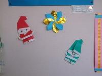 給食の献立表や、教室の入り口のリース 折り紙でつくったサンタクロースなど