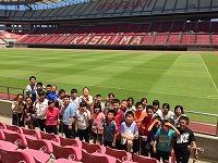 サッカーのグラウンドをバックに記念写真を撮りました。