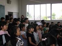 多くの児童が音楽室に集まり、楽器の説明を興味深く聞いていました。
