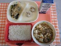 今日の献立は、「ごはん 肉シューマイ 小松菜ナムル マーボー豆腐 牛乳」でした。