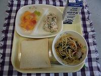 今日献立は、「セルフツナサンド 和風きのこスパゲティ フルーツカクテル 牛乳」でした。