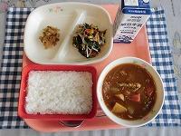 今日の献立は、「ごはん まいたけとさつまいものカレー 福神漬け ほうれん草のサラダ 牛乳」でした。