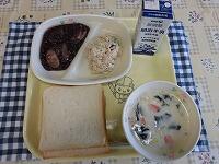 今日の献立は、「セルフツナサンド 白菜のクリーム煮 ぜんざい風デザート 牛乳」でした。