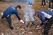 今日は、生徒会主催の「焼き芋パーティー」を開催しました。11月4日(土)に収穫したサツマイモを使い、毎朝、少しずつ集めた落ち葉を使っての焼き芋です。苗植え・栽培・収穫でも大変お世話になった保護者の津久井さんにも来校していただき御指導を頂きました。