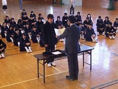 10月17日(木)から平成25年度第2学期がスタートしました。校長先生からは、多くの記念日がつくれるように、いろいろなことに一生懸命取り組んで実りある2学期にして欲しいというお話がありました。その後、県新人陸上大会1年1500mで自己ベストタイムで2位入賞した表彰や2学期の学級委員の任命式が行われ2学期がスタートしました。