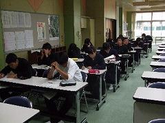 10月3日(木)に竜巻を想定した避難訓練を実施しました。竜巻発生の放送後、先生の指示により生徒たちは机を黒板の方に集めシュルターをつくりその中に逃げ込み、ガラスの破片やガラスを破り飛んできたものから身を守る事を訓練しました。ほとんどの学級で放送後約40秒ほどで避難することができました。