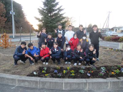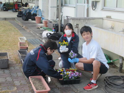 12月1日(月)、放課後の時間を利用して、ボランティア委員会の生徒と担当職員でJR片岡駅西口のロータリー広場にパンジーとビオラの植栽を行いました。この場所にはさまざまなオブジェが設置されており、間もなく約1万球のLEDでライトアップされます。今日、植栽した花もその彩りを添えてくれるものと思います。