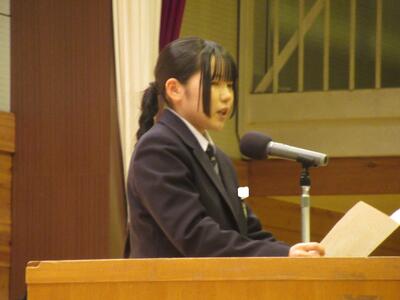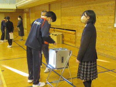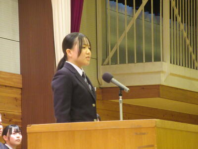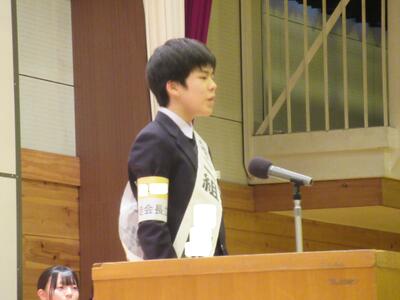 12月5日(金)、来年度の生徒会長及び副会長を選出する生徒会役員選挙の立会演説会が行われました。立候補者の演説に先立ち、責任者による応援演説(立候補者紹介)があり、その後立候補者はどんな生徒会をつくりたいか自分の思いを主張しました。即日投開票が行われ、結果は週明けに選挙管理委員会から発表されます。
