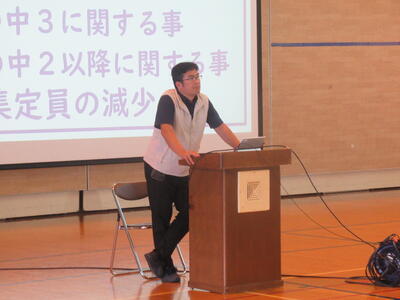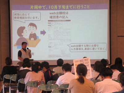 10月2日(木)、3年生の生徒、保護者を対象にした進路PTAを開催しました。前半は私立高校、後半は県立高校の受験(検)の際の手続き方法について、進路指導主事から説明がありました。秋の訪れとともに、受験シーズン突入です。3年生の皆さん、頑張ってください。