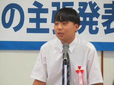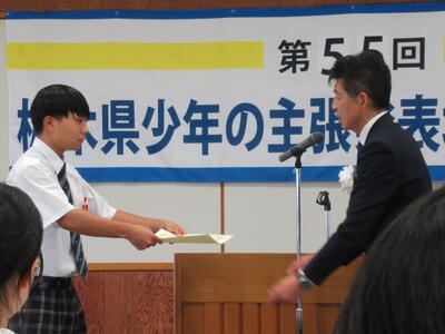 8月29日(金)、塩谷庁舎に於いて第55回栃木県少年の主張発表塩谷地区大会が開催され、本校から代表生徒が出場しました。夏休み中も登校して、この日のために練習を続けてきました。主題は「後悔と協調する選択」です。周囲の意見に流されてしまうことで後悔してきた自分自身の経験をもとに、これからは情報を収集しながら自分自身で判断していきたいという立派な主張でした。