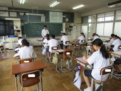 7月18日(金)、夏休み前集会と各種表彰式を行いました。校長から「看護の母」と呼ばれたイギリスのフローレンス・ナイチンゲールの言葉をもとに、夏休み中は適度な睡眠時間を確保しながら、平等に与えられている時間を大切に使って安全・健康を第一に過ごしてほしいという話がありました。学習指導主任からは、40日間の夏休み中にやるべきこと(夏休みの課題)をしっかりやってほしい、苦手意識を克服してほしい、得意分野を更に伸ばしてほしい、という話がありました。生徒指導主事からは、夏季休業中の計画をしっかり立てること、SNSなどの利用に注意すること、川や池で水遊びをしないことなどが伝えられ、最後に休み明けの生活が辛くならないように通常の学校がある時と同じような生活を心掛けてほしいという話がありました。
