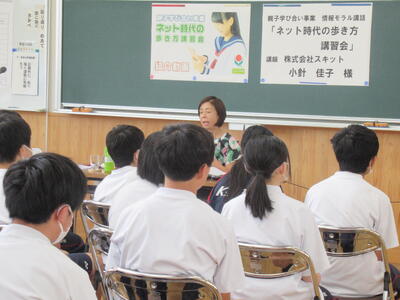 7月15日(火)、外部から専門の講師をお招きして情報モラル講話を開催しました。今回の受講対象は1年生です。夏休み直前のこの時期に、スマートフォン使用によるトラブル(今回のテーマは「グループトークでいじめ そんなつもりじゃなかったのに…」です)を回避するための貴重なお話をいただきました。