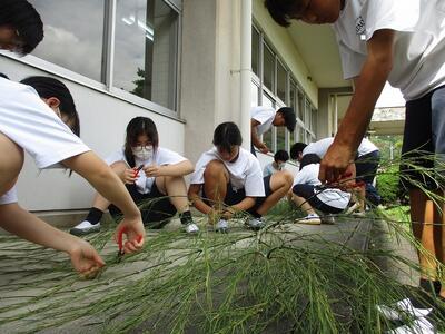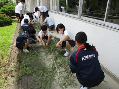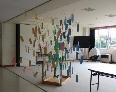 今年も、メディア委員会の発案で、七夕にちなんで各自の願いを込めた短冊を飾りました。校内に展示するので、事前に葉を落とす準備が大変でした。