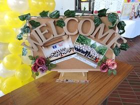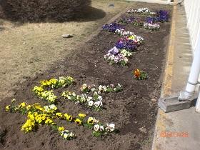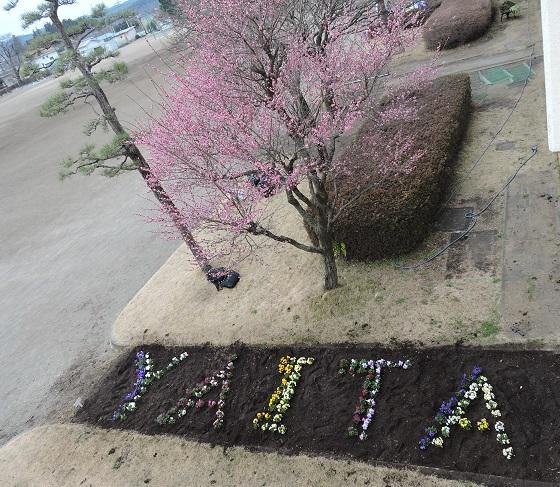 体育館通路脇の花壇には、色とりどりのパンジーの花を上手に配置して花文字・デザインが施されオシャレなウェルカムスペースになっています。今日の離任式や新年度を迎えての新任者にはこの上ない心配りとなっていました。本校で取り組んでいる“花いっぱい運動”の大きな成果です。