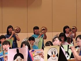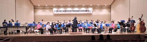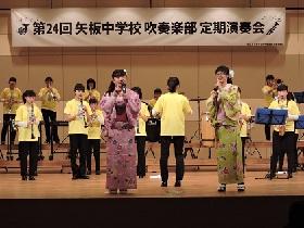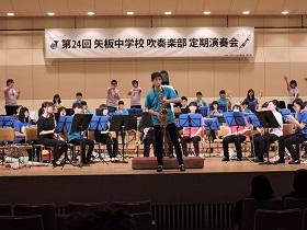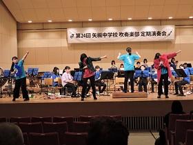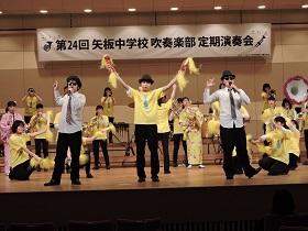 3月25日(日)14時から、矢板市文化会館大ホールで吹奏楽部の定期演奏会が開催されました。これまで、コンクールやコンテスト、各種のイベント等に向けて一生懸命に練習してきた成果を発表していました。第1部は、部員だけの演奏で「マーチ・スカイブルー・ドリーム」「梁塵秘抄」など8曲。第2部では、OB、OGと講師の先生方も加えた46人編成での迫力ある演奏「アンパンマン・メドレー」「ファミリーアニメ・コレクション」など6曲を聴かせていただきました。素晴らしい演奏と部員による様々なパフォーマンスに会場から大きな拍手が沸き上がっていました。アンコール曲には部員一同の熱~~~い思いを込めて「コパカバーナ」を演奏し「定期演奏会」の幕を閉じました。