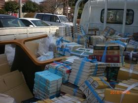 3月28日(水)に、市内小中学校図書事務員と市立図書館派遣スタッフ、生涯学習課学校支援員・教育総務課担当職員での「学校図書廃棄作業」を行いました。春休みに入ってから、矢小・東小の図書室の作業を行ってきましたが、矢板中が最終日となりました。事前に図書事務員さんが廃棄図書の選別などを行い、今回は昭和の時代に受け入れた本を中心に1300冊(1.2t)ほどを廃棄処分しました。その他にも書庫に保管している不要物の廃棄処分も行ったため、トラックの荷台がいっぱいになっていました。