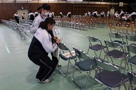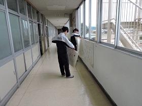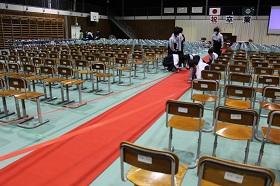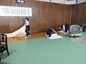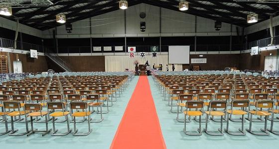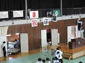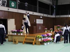 卒業式を明日に控えて、今日の午後には1・2年生と職員で卒業式に向けての準備をしました。式場の設営と装飾を2年生が担当し、玄関や1棟の廊下や通路などの清掃を1年生が行いました。厳粛な式になるようにと、シートの上に真っ赤な絨毯を敷いたり、椅子をメジャーを当ててきちんと並べ直したりして、卒業生が気持ちよく卒業式を迎えられるように、協力し合って活動する姿が見られました。ステージ周辺には鉢花が並べられ華やかさが感じられます。