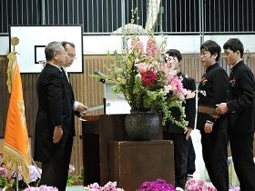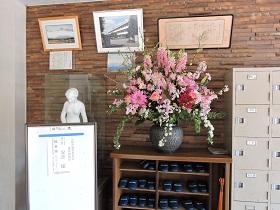 今日の1校時を使って、先日の卒業式の後片付けを行いました。会場に彩りを添えていた花類も、玄関や昇降口などでしばらくの間は管理します。玄関が花の彩りで春の華やいだ装いに包まれています。