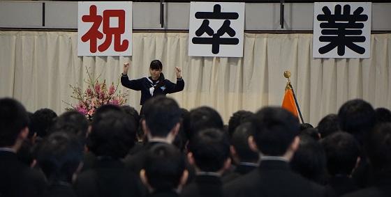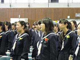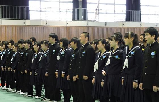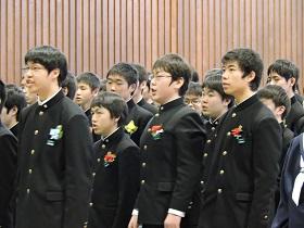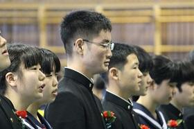 式中で歌った、式歌“仰げば尊し”は、歌詞の意味をかみしめるように歌う姿に、胸が熱くなる思いがしました。また、式の最後で歌った校歌も、感謝の気持ちを込めての清々しい元気あふれる歌声が聞かれました。更に、卒業記念全校合唱“大地讃頌”は、今までお世話になった教職員、保護者や地域の方々への感謝の気持ちと、同級生や後輩とともに矢板中学校で頑張ってきた友情や絆を意識した素晴らしいハーモニーと歌声で、感動的な心が温まる全校生での合唱でした。