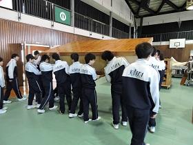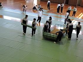 本校の体育館にはステージが無いため、式典の時に臨時にステージを設置します。ステージの設置と収納には男子生徒の力が不可欠ですが、2年生の男子が力強さを発揮して手際よく片付けてくれました。器具庫に収納する時には、カーリングのように針の穴を通すようなコントロールで、うまくハウスに止める技術が必要です。周りからも右や左と声をかけながら作業を進めますが、「そだねー!」と声をかける生徒がいました。2年生のチーム力の素晴らしさと働きに感謝です。