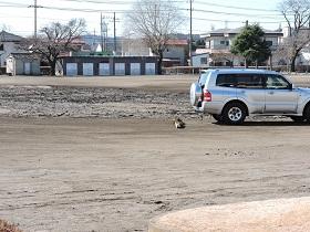 また、“立志式”の時と同様に悪天候の中の“卒業式”となり、保護者の方が駐車していた校庭は最悪の状態でした。泥にタイヤを取られてしまい立ち往生する車もあり、ご迷惑をおかけいたしました。当日は、本校職員が4輪駆動車で牽引しながら対応しましたが、今日もタイヤの轍で凸凹の校庭の整備を、鉄骨を引いて平らに均してくれています。グランドの凸凹はかなり深く手ごわいようです。