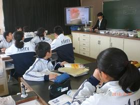 定刻どおりに、学校長の話の後、説明資料をもとに学習指導主任から「中学校での学習の話」、生徒指導主事からは「中学校での生活の話」を行いました。今年度は、生徒会役員が中学校生活や学習についての説明の補助を担当し、それぞれが学校行事の様子や学習やテストの様子・ポイントなどを話してくれました。休憩をはさんで、音楽科担当の職員から、“矢板中学校校歌”の指導を行いました。校歌の指導にも2年1組の生徒達がお手本を示してくれました。素晴らしい歌声での校歌の協力ありがとうございました。入学式での“校歌斉唱”が楽しみです。