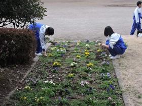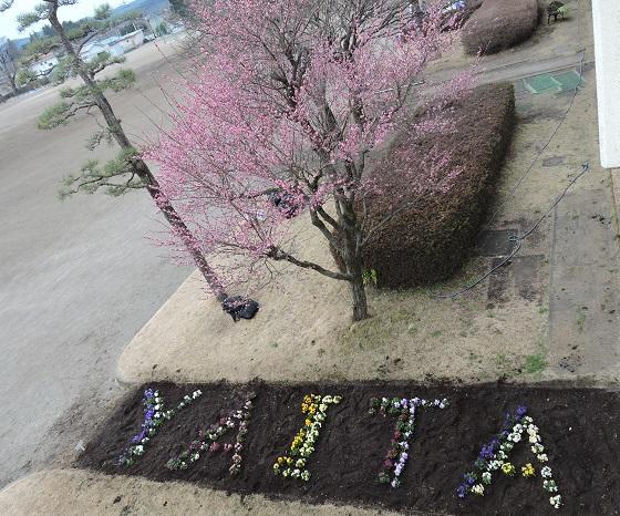 体育館通路脇の花壇には、色とりどりのパンジーの花を上手に配置して花文字・デザインが施されオシャレなウェルカムスペースになっています。今日の離任式や新年度を迎えての新任者にはこの上ない心配りとなっていました。本校で取り組んでいる“花いっぱい運動”の大きな成果です。