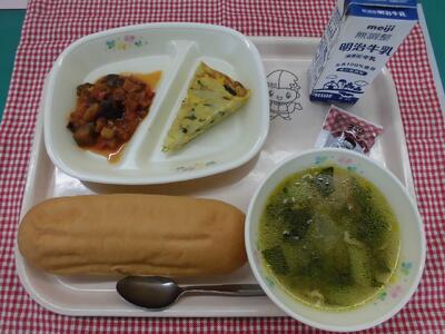 今日の献立は、「コッペパン チョコクリーム スペイン風オムレツ ラタトゥイユ とうがんスープ 牛乳」でした。