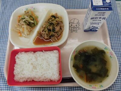今日の献立は、「ごはん 豚にらもやし炒め 小松菜のツナあえ 根菜のみそ汁 牛乳」でした。