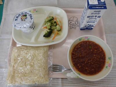 今日の献立は、「肉みそソーススパゲティ グリーンサラダ みかんクレープ 牛乳」でした。