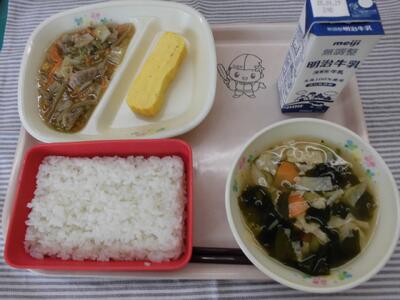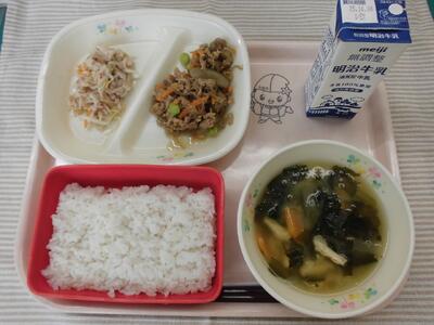 今日の献立は、「ごはん チキン南蛮 中華風もやしあえ 茎わかめスープ 牛乳」でした。