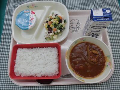 今日の献立は、「ごはん 県産大豆のキーマカレー ほうれん草のサラダ 県産ヨーグルト 牛乳」でした。