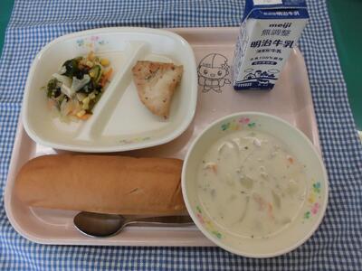 今日の献立は、「黒糖コッペパン 白身魚のフライ 海藻サラダ クラムチャウダー 牛乳」でした。