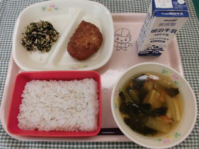今日の献立は、「ごはん 豚肉の生姜炒め ほうれん草のツナあえ なめこ入りけんちん汁 牛乳」でした。
