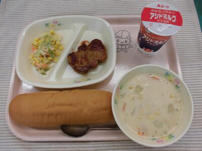 今日の献立は、「コッペパン かぼちゃのハンバーグ コーンサラダ 大豆のシチュー 飲むヨーグルト」でした。