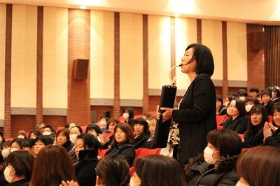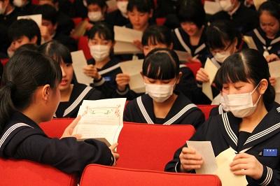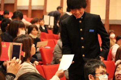 式では、校長先生の「優しい人になってほしい」との話のあと、生徒代表の誓いの言葉、将来への夢・決意、3年生からの励ましの言葉に続いて、エレクトーン奏者 石下有美(いしおろし・ゆみ)先生による演奏とお話、そしてある意味メイン行事と言っていい「親から子、子から親への手紙交換」がありました。