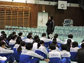 講演では、ご自身の卓球の競技生活のエピソードや「夢や目標を持ち、課題を設定して取り組む。」ことの大切さと「日々前進する!!」というご自身のモットーを示し、オリンピック出場とメダル獲得の経験から、『結果を求めるよりも、その前の準備が大切。』という言葉に生徒も感銘を受けた様子でした。そして、最後には『中学校でしか経験できないこと、味わえないことを大切にし、悔いのない生活を送ってほしい。』とエールを送ってくださいました。