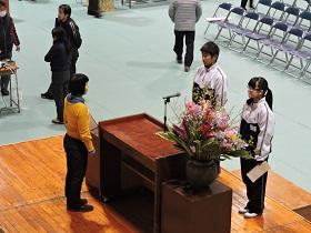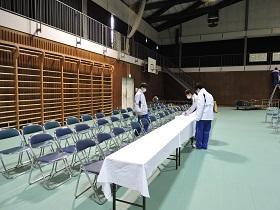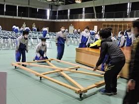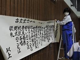 立志式を明日に控えて、今日の6校時には、立志式に向けての準備を行いました。式場の設営と装飾、来賓控え室と体育館通路や体育館周辺、玄関などの清掃を1年生が行いました。1年生は初めて式典の会場準備を担当しましたが、厳粛な式になるように椅子にメジャーを当ててきちんと並べたり、演台やピアノのセッティングなども丁寧にそろえたりして、2年生の先輩が気持ちよく立志式を迎えられるように、協力し合って活動する姿が見られました。