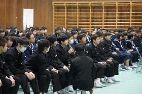 2月2日(金)午前9時15分より、本校体育館において2年生の「立志式」を行いました。昨夜からの雪の影響が残り、厳しい冷え込みと足元が悪い中での行事となり、来賓や保護者の皆様には大変ご迷惑をおかけいたしました。式典では、多くの来賓の方々と保護者や1年生が見守る中、学校長式辞や来賓からの祝辞、生徒代表による「励ましのことば」や「立志の誓いのことば」など、真剣な態度で臨む厳粛な式になりました。