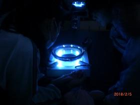 放射線の観察では、アルコールの蒸気を充満させたガラスの器の中で、放射線が白い線となって飛び交うのを確認すると「すごい、見えた」などと、声を上げ、生徒たちは興味をもって取り組んでいました。