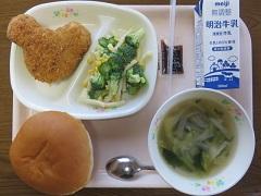 <給食ガイド「今日の献立」> 丸パン、牛乳、手作りコロッケ(3年)、豚肉コロッケ(1,2年)、ブロッコリーサラダ、野菜サラダでした。 3年生にとっては、矢中最後の「手作りコロッケ」でした。味わっていただいたでしょうか?